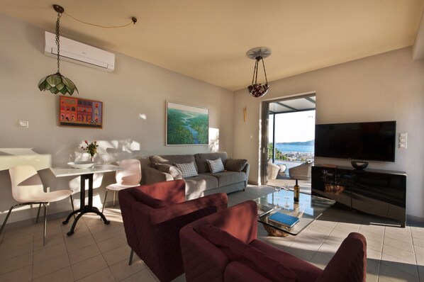 comfortable seating arrangement and a flat-screen TV, seamlessly connected to a