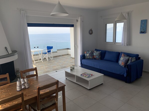 Living area - "On the Rocks" - Cycladic beachfront apartment with spectacular views (Karystos)