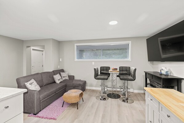 Completely newly renovated 1 KS bdrm + Full sofabed, 1 bthrm lower level walk-out w/70in TV & 1 off-street parking spot included. One additional for extra fee if needed.