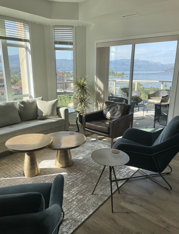 The #1 feature is the 260 degree view of Okanagan Lake, the Yacht Club marina, the Bennett Bridge, city lights, mountains and beach. Watching the sail boats, parasails, regattas and float planes landing right in front of you is an activity in itself.