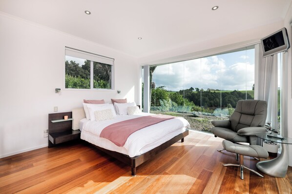 Solar House sleeps up to nine guests across five comfortable bedrooms: three with king beds, one with a queen, and another with a single perfect for a large family or group of friends. The master bedroom has its own ensuite, while a second bathroom with a bath is ideal for unwinding after a day of adventure.