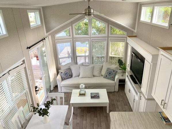 Escape to a tranquil waterfront retreat at this tastefully decorated, modern 2 bedroom tiny house in Key Largo Kampground & Marina. Enjoy evenings under patio lights on the outdoor area with large dining table, lounge chairs and grill or take advantage of the private dock for your boat. With 2 kayaks available for use and a heated swimming pool nearby, you'll find plenty of opportunities to unwind.