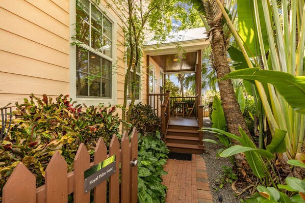 At Travelers Palm Inn, immerse yourself in a serene botanical hideaway with lush garden views from your private deck. Enjoy the tranquil ambiance by the pool and waterfall feature, or unwind on your porch with a crafted cocktail.