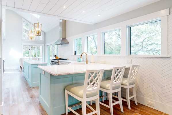 Double doors open to the foyer which leads to the spacious living area featuring hardwood floors, a cathedral ceiling, a custom fireplace, a massive flatscreen TV, and an expansive private outdoor deck. Just off the living area, the designated dining space offers seating for eight and opens directly onto the lagoon-facing side deck with beautiful views. The deck offers comfortable outdoor seating and a high-end BBQ grill, perfect for family meals outdoors and stunning views while you eat. The gourmet kitchen features brand-new luxury appliances, a breakfast bar with seating for three, a separate built-in coffee bar, a kitchen nook with seating for four, and access to the private deck. The laundry room is located just off the kitchen hallway with a full washer and dryer set, as well as storage. A half bathroom is located in the same hallway, just off the main entryway.