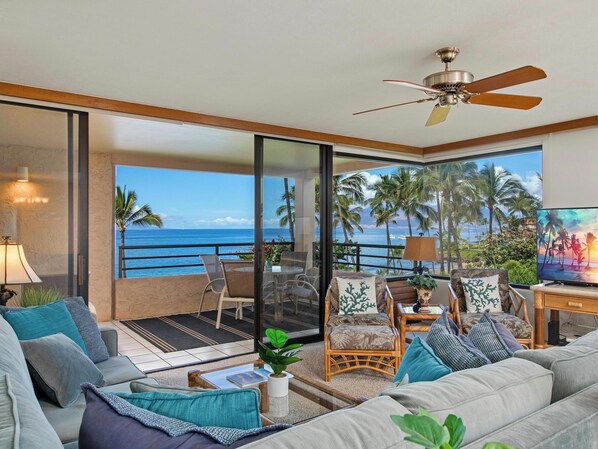 One of the standout features of this condo is the private lanai, where guests can unwind while taking in stunning sunset views over the ocean. This oceanfront lanai is accessible from the living room and a seperate private enterance from the primary bedroom.