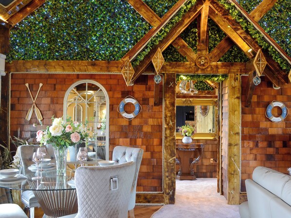 Patio doors lead to the raised decked area which overlooks the pond, and is where you can enjoy an hour or so in your private hot tub, taking in the wonders of the dark skies. The owner has a luxury hair, beauty, tanning and aesthetics clinic just a 2-minute walk from the property and you can book anything from a hair up to a pamper day or even a full face rejuvenation.