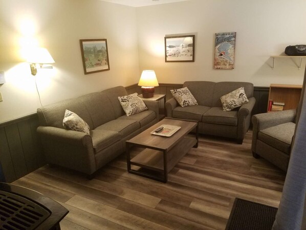 Each townhome sleeps 6 guests and features gas fireplace, Free Wifi, sauna, sleeper sofa, full kitchen, washer/dryer, king bed, three twin beds.