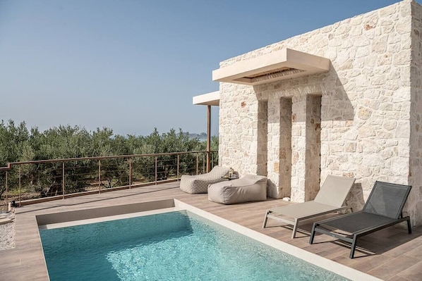 Experience the beauty of Crete at Melissa Luxury Villa, surrounded by lush green olive trees and boasting a private pool with children's section. Enjoy outdoor dining under a pergola, an electric grill for smokeless cooking delights, and seamless indoor-outdoor living through large patio doors.