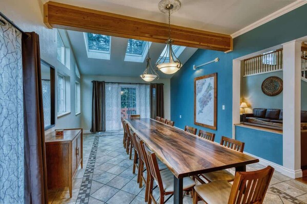 As you make your way inside, you’ll be greeted with a glamorous open-concept living room area comprised of beautifully laid ceramic tile flooring, cathedral ceilings, and large windows & skylights ushering in floods of natural light. Once you’ve settled in, crack open a bottle of wine and make a toast to a well-deserved vacation as you make yourself comfortable on the back patio deck – an ideal spot to get a breath of fresh mountain air as the dappled sunlight filters through the trees.
