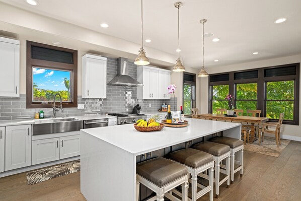 We are a family of six (2 adults and 4 kids all under 12 years old). We travel a lot and many times in Hawaii and Kauai. We had excellent communication with the property manager Jessica before and during our stay. She knew we were landing well before check in time. She gave us great updates on when the house would be ready. When we got in the house, we were greeted with the wonderful trade winds flowing through the house and Hawaiian music planting throughout the house. We truly felt like we were finally in Hawaii. The home is large and modern. All three bedrooms worked great for us. The kids loved the bunk bed room. I mean loved. Who wouldn’t love those cool bunk bed stairs? All the bathrooms are wonderful. Loved the big towels and there were plenty of them. The Sonos sound system is amazing. Recommend downloading the app so you can control the music in different rooms. The downstairs lanai is wonderful. There is nothing but open land on the one side. We would sit in the chairs and watch the clouds fly by from the trade winds. At night you have a huge view of the stars. I miss it. Pool is smalish but works great for cooling off. We used the hot tub more, which we didn't realize it had until we got there. Only areas of suggestions for the house: an outdoor table would be really nice to eat at instead of balancing plates on lap or coffee table. The home could use a few more pieces of Hawaiian decor. Not sure if it was due to covid but basic cooking staples would be nice, spices and oil, etc. We will stay here again for sure.