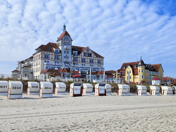 The house "sea view" (former Kurhaus of Kühlungsborn) was rebuilt in the year 2000 after the model of the old Kurhaus of Kühlungsborn and is located directly on the beach. The architecture of the house combines style elements from the turn of the century with modern and comfortable requirements of our time. Two glass elevators lead you through the huge, green, glass-covered atrium to your apartment.