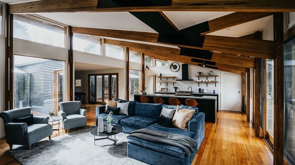 Escape to Park Crescent, a charming rustic retreat amidst lush gardens and rolling hills. This beautifully designed home features exposed beams, high windows, and a spacious dining area perfect for gatherings. Enjoy the private decks, outdoor dining options, and serene atmosphere.