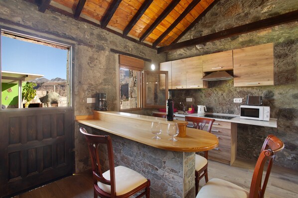 The holiday home Villa Paraiso Aldeano 1+2 is located in La Aldea de San Nicolás and impresses guests with its view of the mountain. The 60 m² property consists of 2 houses equipped for 4 people each. The home consists of a living room with a sofa bed for 2 people, a fully-equipped kitchen, 2 bedrooms and 1 bathroom and can therefore accommodate 8 people. Additional amenities include high-speed Wi-Fi (suitable for video calls) with a dedicated workspace for home office as well as a TV.