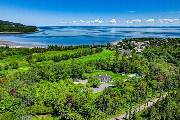 Surrounded by fruit trees in a private domain, this ancestral home offers a heated pool and breathtaking views of the river. Relax with Wi-Fi, TV, and outdoor furniture or explore nearby attractions like the Casino de Charlevoix and Manoir Richelieu.