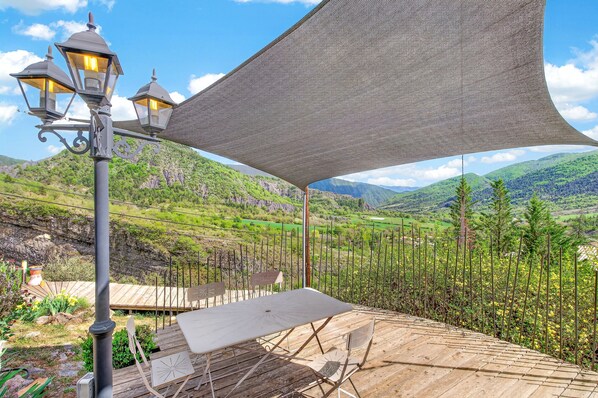 Relax on the private balcony or the covered terrace with shade sail, both offering views of the mountains and valley. The shared garden provides additional outdoor space to unwind. A private barbecue is available for outdoor dining in a peaceful setting.