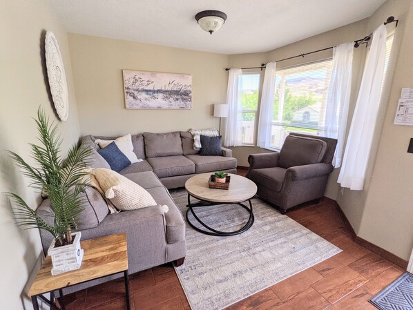 Our 2-level home features 5 bedrooms with a King or Queen bed in each. 3 full bathrooms easily accommodate large families or groups. There is a full kitchen stocked with everything you need to cook and enjoy meals together, along with a few extras - coffee, creamers, tea, honey, spices/seasonings, and olive oil. We supply pots and pans, mixing bowls, eating and cooking utensils, all dishes and cups, as well as a coffee maker, electric kettle, crock pot, toaster, griddle, blender, and bakeware. The table seats 6, and has 2 leaves available to expand and accommodate more! There is also a dishwasher. 👍