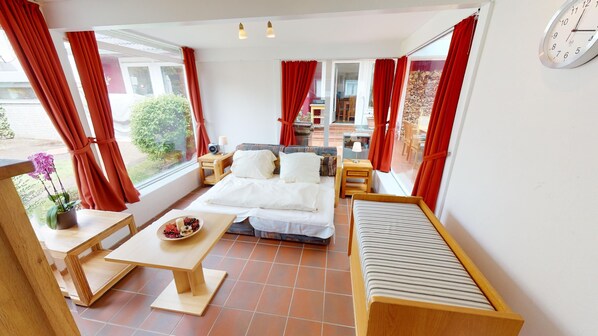 It has a kitchen with dining area, a combined sleeping area with a comfortable seating area (double sofa bed), TV, Interzugang (W-Lan), shower / WC