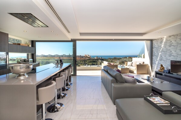 Luxury state of the art, spacious apartment, set within an exclusive residential development. This spacious accommodation with fantastic sea views in a perfect location just 3 minutes away from a wonderful beach and a short stroll into the quaint fishing village of Ferragudo with its variety of restaurants and cafes. The apartment is finished to an exceptionally high standard, with 3 large bedrooms, all with amazing ensuites, large living areas with TV and WiFi, a state of the art kitchen with integrated appliances. The apartment benefits from spacious private outdoor entertaining areas including a front balcony and roof terrace which features a private infinity pool and BBQ, creating the perfect setting to eat, sunbathe and relax. Pool heating is available upon request at 175 Euros per week.