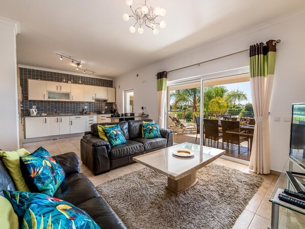 At Apt. Vista Palmeira, unwind in the spacious open-plan living room with a dining area and modern kitchen. Step outside onto the large terrace overlooking the pool and gardens or relax in one of three airy bedrooms.