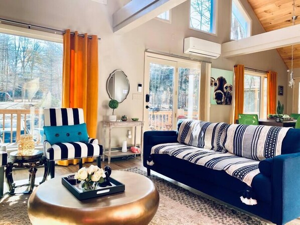 Come stay with Explore Poconos and experience 4-season bliss at our 4-bedroom Hideout chalet. Enjoy an open living area, gourmet kitchen, and a screened porch. The basement is an entertainment haven with games, movies, and a bonus room. Relax in the master suite, and gather around the fire pit outside. Your ideal retreat!