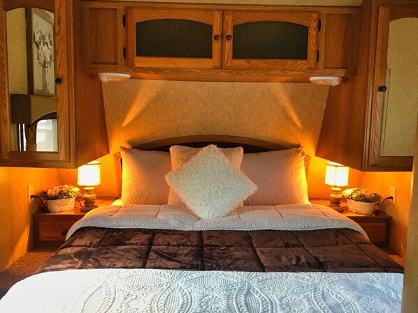 The 32-ft Dutchman Coleman camper has a private bedroom with a queen-sized bed, bathroom with shower, kitchen with stove and refrigerator, and living area with an additional pull-out queen-sized bed. Additional regular-size table top sleeping is also available for camper rating sleeps six. Complete with dishes, utensils, cookware, and linens, it is set up with everything you need for a cozy camping adventure. With private access to the national forest for hiking, hunting, horseback riding, and many other outdoor adventures, this idyllic setting is quiet and peaceful, and it can be yours to experience and enjoy.