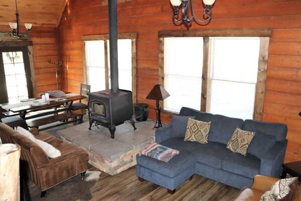 There are many positives about this cabin! It is located on a pine-covered ridge about 2 miles from 11-Mile State Park with a lovely view of the hills from the south-facing deck. The cabin had ample space for 4 adults, and was reasonably clean. The kitchen had good working space with appliances that worked well. The furniture in the living spaces were comfortable. The older gas grill on the deck also worked well, though it probably needs to be replaced soon as it's interior is very worn and pitted. We enjoyed the three hummingbirds who seemed to make the deck their home, especially once we filled the feeder with syrup water. Our main criticisms are 1) the lack of towels, 2) the initial lack of hot water, and 3) the inability of the window screen to stay on in the upstairs bedroom. Despite booking for 4 adults, only 2 bath and no kitchen towels were provided. We initially had no hot water for 2 days until we figured out to play with the hot water adjustment knob at the base of the hot water heater in the utility closet. Even then, the temperature adjustment for the only shower was "wonky", being only able to obtain tepid showers despite hot water at the sinks. The upstairs window screen was found lying on the ground below, and fell out again after reinstallation because of missing attachment points. There was no recycling bin. Despite these nuisances, we enjoyed our stay very much. The area was very quiet and peaceful, and had good park access. We would stay there again.