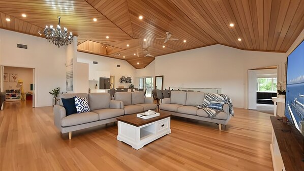 • Stunning open plan living areas with 75 inch smart TV, reading area with books and casual seating around the fireplace