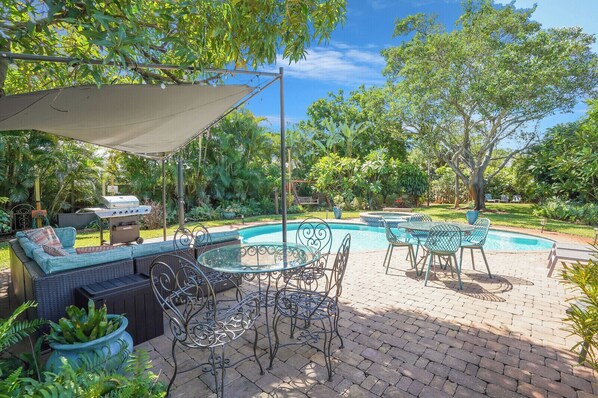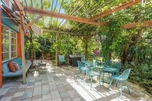 Artistic Magical Apt., stunning garden, private patio, pool, close to beach/town