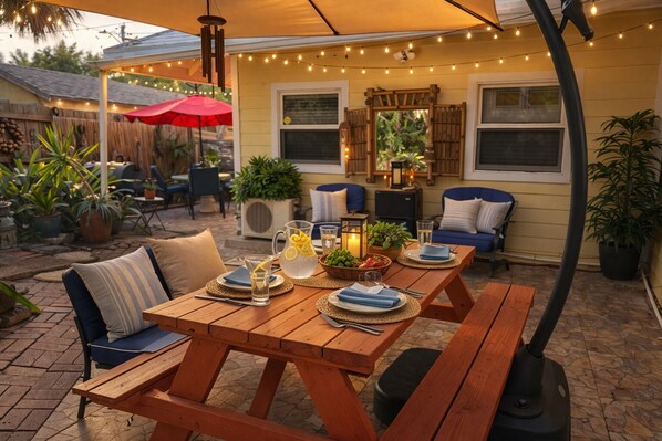 You have a private patio at your front door and a parking spot. However, all the other gardens are shared as well as the laundry room. The fenced in property consist of a two bedroom one and a half bath two-story main house…and a one story one bedroom addition.
