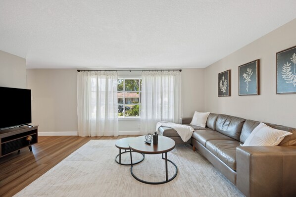 • Spacious Living Area: The open-concept living space is perfect for gathering, featuring modern furnishings and plenty of natural light. Enjoy the variety of streaming services we have. (Netflix, YouTubeTV, Max, etc.)
