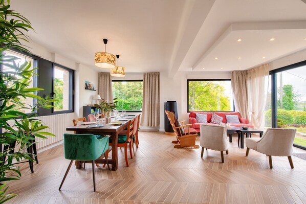 Enter through the entrance door and let yourself be seduced by a large living room with access to the garden through a bay window. The open, modern and fully equipped kitchen (refrigerator, freezer, oven, microwave, dishwasher) provides you with everything you need to cook as if at home. For your breakfasts, a filter coffee maker, a Senseo machine, a kettle and a toaster are also available. Share your meals around the dining table or, on beautiful days, enjoy the one on the terrace. In the evening, relax in the lounge area, comfortably seated on sofas and armchairs in front of the television, near the pellet stove.