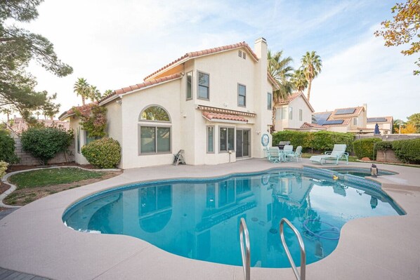 Experience the perfect blend of comfort and sophistication in this stylish two-story Airbnb in North Las Vegas, featuring four spacious bedrooms and three modern bathrooms, ideal for families. Relax by the sparkling pool, enjoy quality family time, and make memories with your furry friends at our charming retreat.