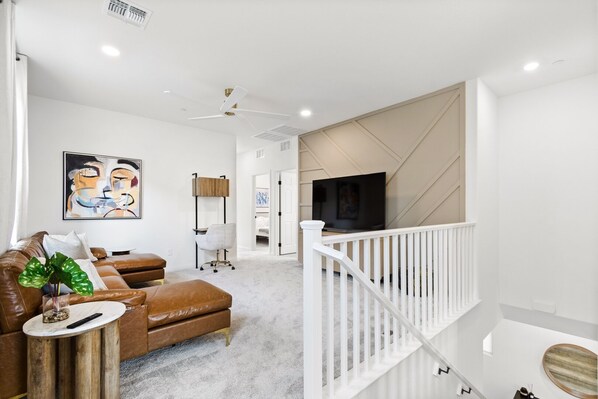 All bedrooms are fully furnished with brand new memory foam mattresses, side tables with USB outlets and touch night lamps, dressers, and ceiling fans in each room. A 75" led smart TV in loft and living room included. Led canned lights upgraded. All linens, towels, comforters, included.