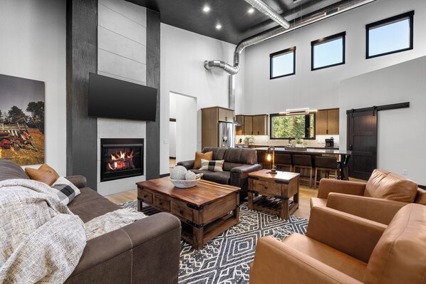 Step inside to an expansive open-concept living, dining, and kitchen area, where large windows fill the space with natural light and capture the scenic surroundings. The beautifully appointed kitchen features high-end finishes, stainless steel appliances, and a large island perfect for gathering and entertaining. The cozy living room invites you to unwind after a day of adventure, complete with comfortable seating and a warm, welcoming atmosphere.