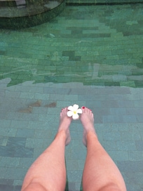 Guests at Ossotel Legian Bali relax on white sand with comfy loungers. This upscale resort near Kuta Beach features a coffee shop, garden, Romeos Bar and Grillery, outdoor pool, kids' pool, WiFi, and helpful multilingual staff.