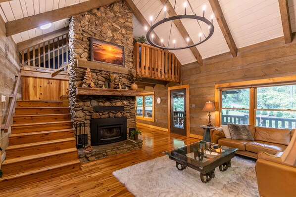 The main level of the house features an upgraded kitchen boasting modern cabinets, solid stone counters, and stainless appliances and is fully stocked with everything you'd need to prepare a tasty meal to enjoy together at the picnic-style dining table. The spacious living room has leather furnishings; exposed beam cathedral ceilings; a 2-story stone woodburning fireplace and a flat screen TV.
