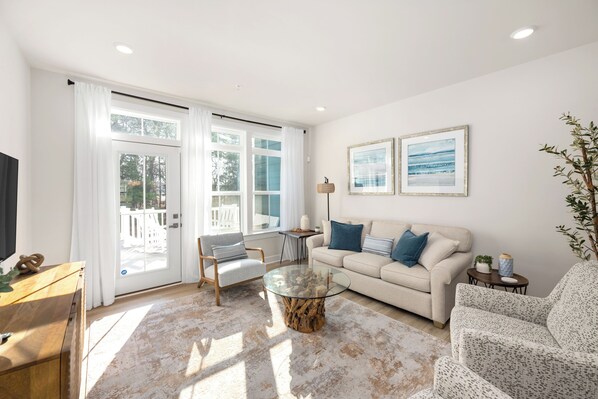 - Cozy Living Room: Relax in the main living space with a large TV and plush seating.