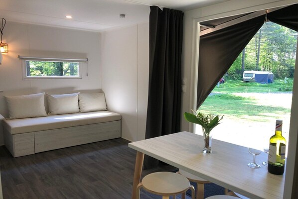 Enjoy the best of two worlds in the fantastic Siesta Lodge, a cozy retreat combining the ease of a mobile home with the whimsical charm of a glamping tent. Carefully designed for small families or groups, this 30 m² lodge provides everything you need for a serene and memorable getaway. Step inside and find a cozy and welcoming living area, where two single beds in the en-suite bedroom are complemented by a sofa bed hidden away in the lounge, providing flexible sleeping arrangements for all. The kitchen is well-furnished with all the appliances you require to cook delicious meals, and the en-suite toilet and bathroom provide a unique touch of convenience and privacy. Siesta Lodge has a private parking area of its own, so you can go around the area without any hassle. The Siesta Lodge is not just a peaceful retreat, it's perfectly located for adventure. Antwerp, a historic and cultural city, is only 30 minutes away from the lodge. Don't miss the Rubens House, the Chocolate Museum, and one of the oldest zoos in Europe. If you're bringing the family, Bobbejaanland is only 20 minutes away, an adrenaline-packed amusement park with family-friendly shows. Nature lovers will also appreciate the lovely walking trails in the area, and to get some fun with water, De Lilse Bergen and Netepark offer outdoor pools to splash around on warm summer days. After exploring the area, return to the campsite and experience Spain at La Cantina restaurant, where delicious tapas and refreshing sangria are served with live flamenco guitar music on weekends. Or, for a more laid-back experience, stop by the campsite bar to relax with drinks and snacks.