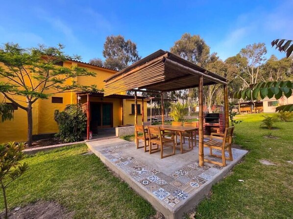 Bungalows de Casa Verde offers an eco-friendly experience to disconnect from the city and enjoy nature, perfect for relaxing, having fun, or working remotely from the countryside. Location and Space The Duplex Bungalow is approximately 130m² and offers: Rooms: 2 bathrooms, 2 bedrooms with 1 queen bed each, 1 bedroom with 2 bunk beds (4 beds). Amenities: A fully equipped kitchen with cookware and gas, TV room with cable, desk, covered terrace, grill, WiFi, and hot water. Additional Services: Breakfasts, pizzas, and prepared meals are available for direct delivery to your bungalow. Check our menu. Common Areas Guests of all bungalows share the following common areas: Recreation: Swimming pool, children's pool, and lounge. Entertainment: Outdoor games for children, soccer and volleyball court, billiards table, ping pong, foosball, sapito (frog game), and board games. Social: Clubhouse with dining room and TV room, extensive gardens, and a bonfire area. Guest Services Our team is available to assist with any inquiries. We have staff on-site who can provide guidance and attend to requests within the hours established in our regulations. Environmental Commitment At Bungalows de Casa Verde, we care for natural resources by integrating sustainable practices into every aspect of our operation. We use solar energy to reduce environmental impact, which means limited power outlets and softer lighting, offering an authentic and sustainable experience in harmony with nature.