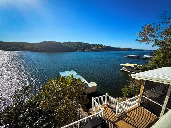 Step into the main level, where you’ll find a spacious master suite with a private bathroom and stunning panoramic lake views from its own private deck. A bunkroom with plenty of sleeping space and a queen bedroom both offer beautiful views of the lake. A second full bathroom provides comfort and convenience for your group.