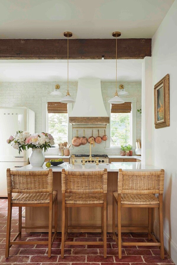 Large home with wonderful fully-stocked French country chefs kitchen including antique terracotta tile floors, SMEG appliances, wine fridge & retro inspired range. Beautiful garden & covered patio for outdoor dining. Cozy library and living room with a gas fireplace. Rooms are airy and large, and decorated impeccably with authentic and charming details.