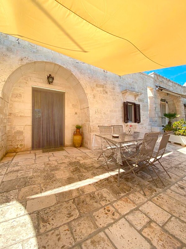 The property is surrounded by a garden and an enclosed south-facing courtyard paved with traditional old stones (chianche). The courtyard has sun loungers for relaxing; a barbeque, garden table and chairs for al fresco dining