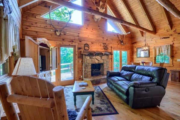 Disconnect and bring your fishing rod. This cozy log cabin comfortably sleeps up to 4 guests with 2 private bedrooms, both with queen size beds First-floor full bath, and a half bath upstairs. Enjoy nature sitting on the wrap around porch. Nice picnic area with grill. Prepare your meals in the well equipped kitchen and enjoy the hot tub after a long day of hiking.