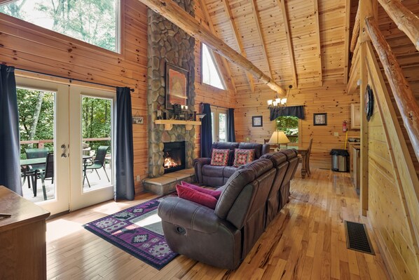 Great room that is open to the dining space and kitchen area, couch seating, and Smart TVs with Starlink wifi.