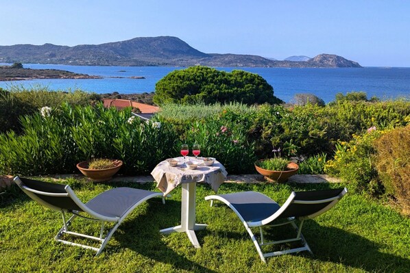 The balcony overlooks the beautiful bay of Porto Istana and is equipped with a built-in barbecue and tables, benches, chairs and deckchairs for eating or just relaxing while contemplating the view.
