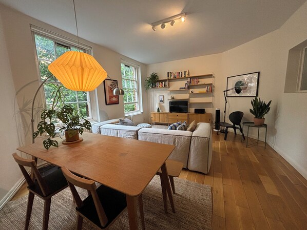 This beautifully designed room is adorned with artwork, plants, and modern light fixtures, reflecting the hosts' taste and style. Wooden accents, from the floors to the drawers and dining table, add a touch of elegance and a natural feel to the space. The cosy beige sofa centres the space and acts as a divider between the dining and living areas, offering a perfect spot to relax, stream your favourite shows on the TV, or curl up with a book from the bookshelf. The dining table, with its two chairs and rustic bench, invites communal dining, making it an ideal spot to enjoy a local takeaway from Shoreditch’s infamous restaurants.