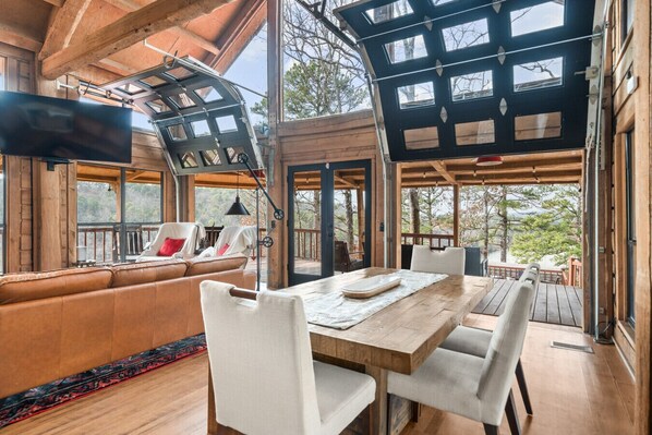 Living Room Step into a spacious living room with a wall of windows showcasing breathtaking views. Relax on the comfy couch and chairs by the wood-burning stove, or catch up on your favorite movies on the big-screen smart TV. Stay connected with high-speed Wi-Fi for all your devices.