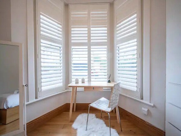 The bedroom is spacious and comfortable with a double-size bed. The bed is situated against the wall along one side to allow more floor space. The bed is only accessible from one side of the bed. There is ample storage space for clothing and belongings with large fitted wardrobes. There is a free standing full-length mirror. There is a large window that allows light to flood in. There are white shutters on this window. There is a ceiling lamp for lighting. This bedroom is located at the front of the property overlooking the street. There is a desk and chair available in this room for those wishing to work or study during their stay.