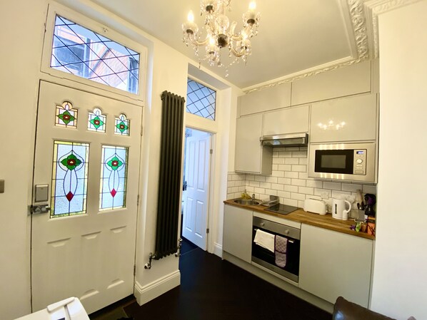 Set within a gorgeous historical building this cosy suite is the perfect home from home. Accessed via a private front door the lounge/kitchenette is fully kitted with fridge freezer, full sized oven, electric hobs, washing machine, Flat screen TV and sofa. The bedroom features a modern ensuite shower room, 2 twin or 1 queen sized bed and wardrobe.