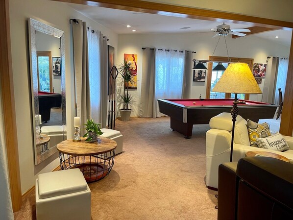 Master bedroom w TV, 2nd and 3rd w TV bedrooms. Living room w 4K TV and Xbox, Family room with pool table. Dining table for 8, full kitchen with indoor laundry. Dedicated parking, WIFI. 8 guests. No more than 12 people at property at any one time.